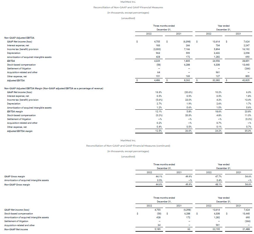 MariMed’s management uses several different financial measures, both GAAP and non-GAAP, in analyzing and assessing the overall performance of its business, and making operating decisions, planning and forecasting future periods. The Company has provided in this release several non-GAAP financial measures: Non-GAAP Gross margin, Non-GAAP Net income (loss), Non-GAAP EBITDA, Non-GAAP Adjusted EBITDA, Non-GAAP EBITDA margin and non-GAAP Adjusted EBITDA margin, as supplements to Revenue, Gross margin, Net income (loss) and other financial measures prepared in accordance with GAAP.