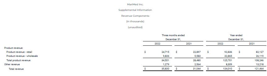 The Company also anticipates opening new wholesale facilities in both Illinois and Missouri. Revenue and Adjusted EBITDA are projected to grow over the course of the year as these new facilities become operational. MariMed anticipates significant increases to its headcount in 2023 ahead of these new and expanded assets coming online.