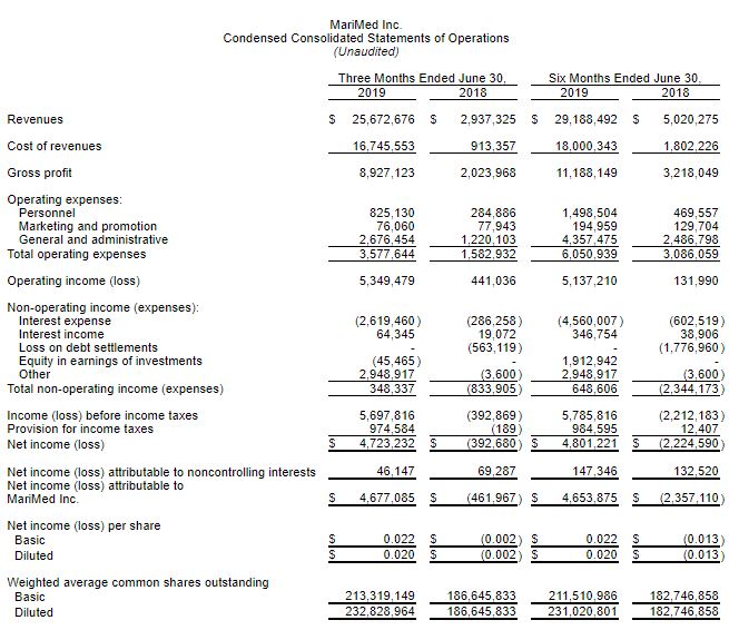 MariMed Inc. Reports Record Q2 2019 Results; Revenue Up 774% to $25.7 Million, Net Income of $4.7 Million