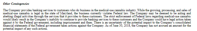 The company filed its 10-Q for the second quarter today and detailed its expansion over the past six months. The bank now reports deposits of $27.8 million (4.5% of deposits) and has loan balances of $15.3 million (2.2% of all loans). It also reports that medical cannabis customer accounts were primarily responsible for its $566,000 increase in deposit service charges in the first half of the year.