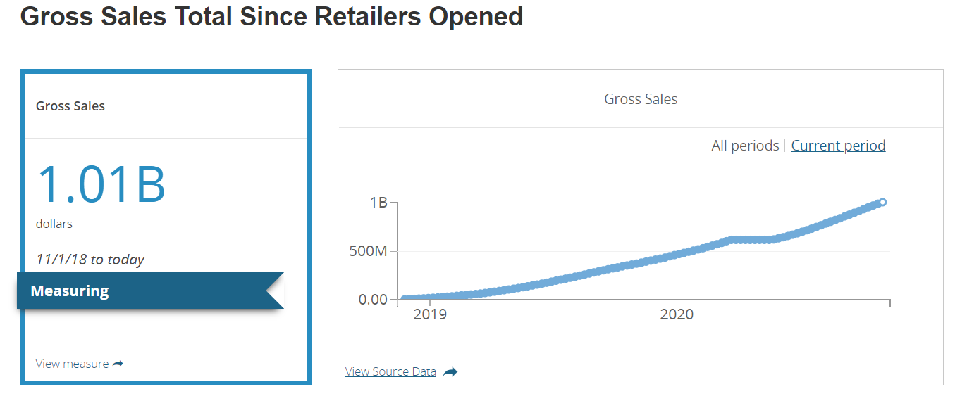 At close of business on Friday, October 30, aggregate data recorded in Metrc by 80 Marijuana Retailers operating statewide reached $1,000,521,905, coming nearly two years after the first two adult-use stores on the East Coast opened their doors November 20, 2018.