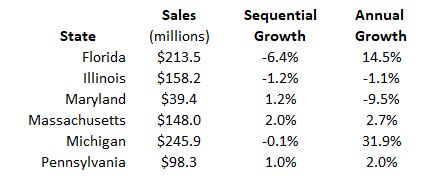 BDSA provides coverage for Florida, Illinois, Maryland, Massachusetts, Michigan and Pennsylvania. In May, year-over-year growth ranged from -9.5% in Maryland to +31.9% in Michigan. Note that Florida, Maryland and Pennsylvania are medical-only markets, though Maryland has introduced adult-use in July. Sequential growth was negative in three markets and in all markets on a per-day basis.