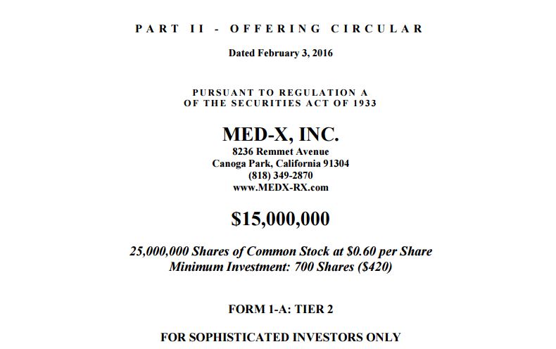 This management team is asking $15mm for 21% of its company. Med-X, based in Los Angeles, is actively pursuing a crowd-funding campaign, the first cannabis-related company to do so via a new program known as Regulation A+. The company, which had received non-binding indications of interest from over 1100 investors for a total in excess of $3.6mm, announced yesterday that it is now accepting orders to buy its stock.