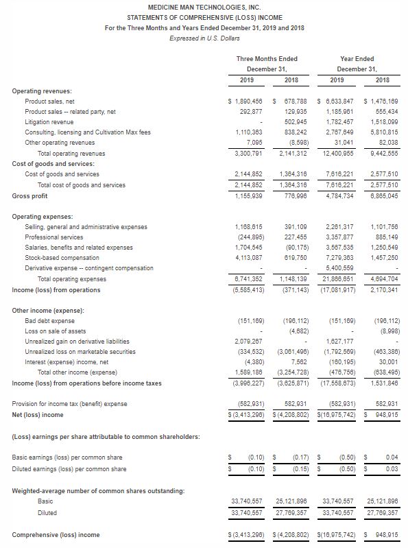 DENVER, March 30, 2020–(BUSINESS WIRE)–Medicine Man Technologies, Inc. (OTCQX: MDCL) (“Medicine Man Technologies” or “the Company”) today provided a company update and announced financial results for its fourth quarter and full year 2019.