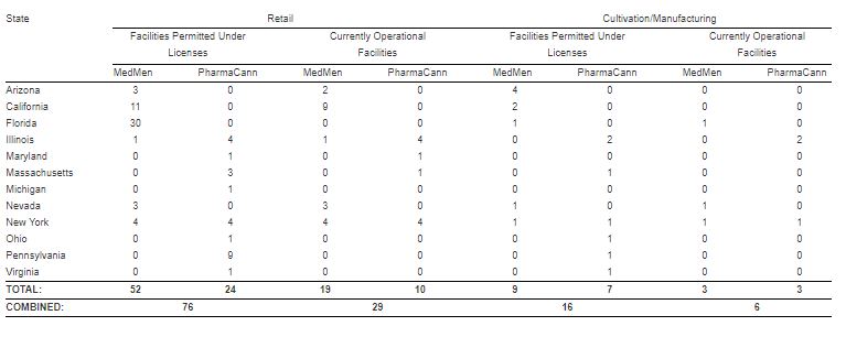 - Combined, MedMen and PharmaCann would be licensed for 76 retail stores and 16 cultivation and production facilities, including pending acquisitions by MedMen and PharmaCann.