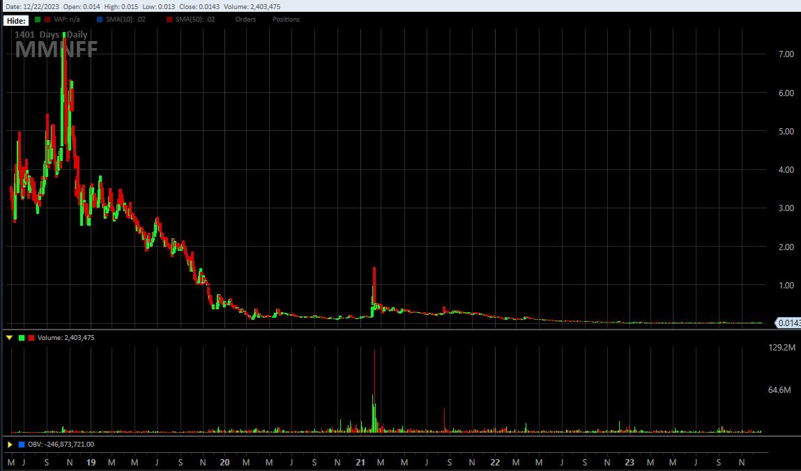 MedMen has been a terrible stock, though it is not doing too badly in 2023, roughly unchanged at $0.014. In early 2019, it was above $3, so it has lost over 99% of its value since then. It peaked near $7 in Q4 of 2018.