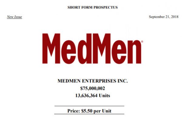 LOS ANGELES, Sept. 22, 2018 (GLOBE NEWSWIRE) — MedMen Enterprises Inc. (“MedMen” or the “Company”) (CSE: MMEN) (OTCQB: MMNFF) (FSE: A2JM6N) is pleased to announce that it has filed and obtained a receipt for its final short form prospectus (the “Prospectus”) in connection with its previously-announced C$75,000,000 bought deal financing (the “Offering”) led by Eight Capital and Cormark Securities Inc., as co-lead underwriters, and including GMP Securities L.P. (collectively, the “Underwriters”), involving an offering (the “Offering”) of 13,636,364 units (the “Units”) at a price of C$5.50 per Unit (the “Issue Price”) for gross proceeds of approximately C$75,000,000. Each Unit consists of one Class B Subordinate Voting Share in the capital of the Company (each, a “Unit Share”) and one-half of one share purchase warrant of the Company (each whole share purchase warrant, a “Warrant”). Each Warrant will entitle the holder thereof to acquire, subject to adjustment in certain circumstances, one Class B Subordinate Voting Share in the capital of the Company at an exercise price of C$6.87 for a period of 36 months following the Closing Date (as defined herein). The Company has also granted to the Underwriters an option (the “Over-Allotment Option”) exercisable for 30 days after the Closing Date to purchase up to an additional 2,045,454 Units (or components of the Units), which, if exercised in full, would result in additional gross proceeds to the Company of C$11,250,000. The net proceeds from the Offering will be used for expansion of the Company’s retail network, development of cultivation and production facilities, to fund operating cash flow and for general corporate and other working capital purposes. The Offering is expected to close on or about September 27, 2018 (the “Closing Date”) and is subject to certain conditions.