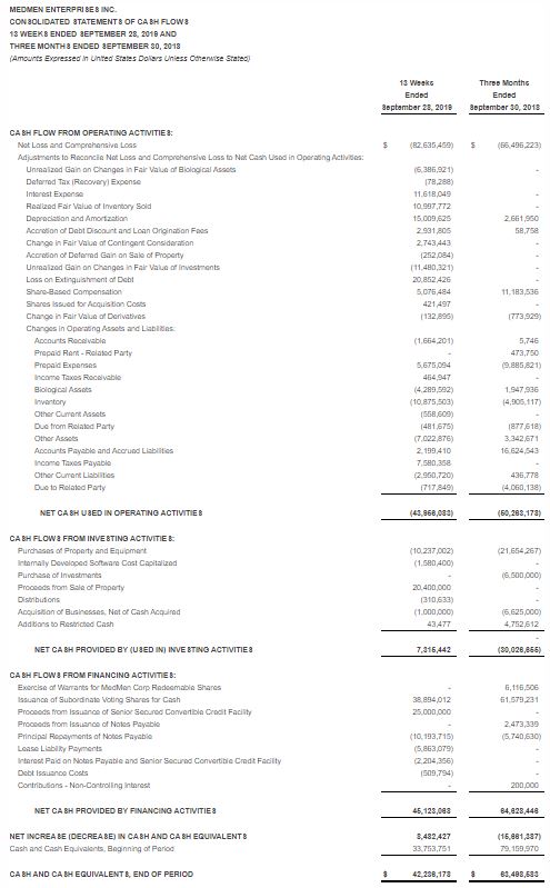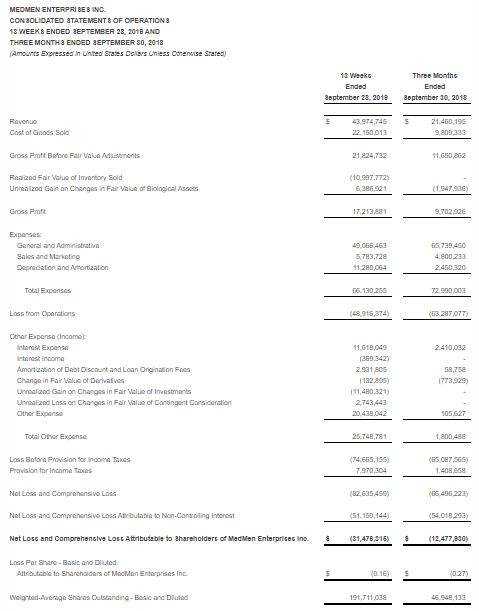 LOS ANGELES, November 26, 2019–(BUSINESS WIRE)–MedMen Enterprises Inc. (“MedMen” or the “Company”) (CSE: MMEN) (OTCQX: MMNFF) today released its consolidated financial results first quarter 2020 ended September 28, 2019. All financial information in this press release is reported in U.S. dollars, unless otherwise indicated.