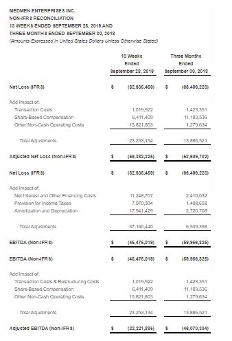 MedMen refers to certain non-IFRS financial measures such as Earnings Before Interest, Taxes, Depreciation and Amortization (EBITDA), adjusted EBITDA (defined as earnings before interest, taxes, depreciation, amortization, less certain non-cash equity compensation expense, including one-time transaction fees and all other non-cash items) and four-wall retail gross margins. These measures do not have any standardized meaning prescribed by IFRS and may not be comparable to similar measures presented by other issuers.