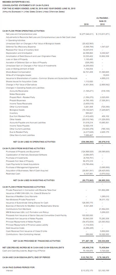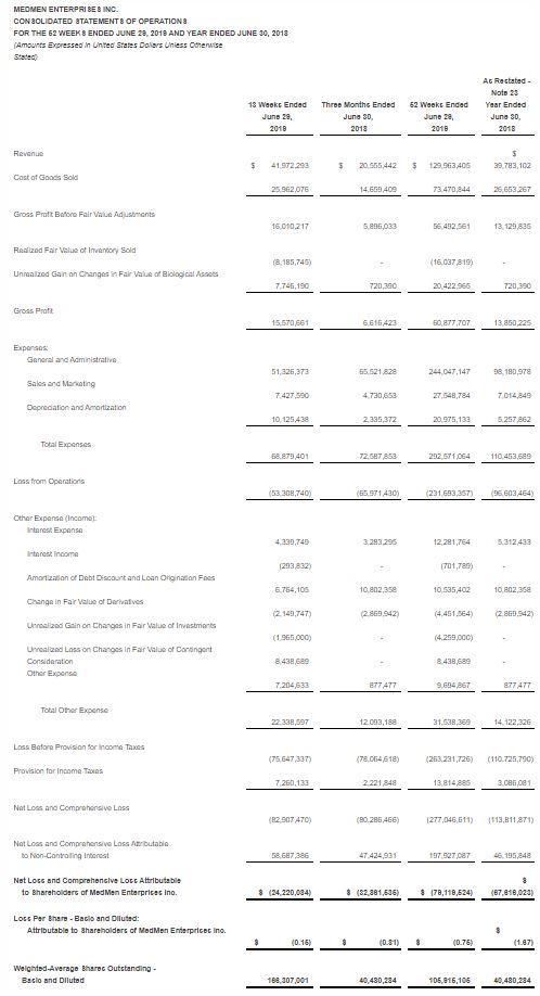 • Net Loss: Net loss was $277.0 million, with net loss attributable to shareholders of MedMen Enterprises $79.1 million or loss of $0.75 per basic and diluted share attributable to MedMen Enterprises shareholders for fiscal 2019, compared to a net loss of $113.9 million, with net loss attribute to shareholders of MedMen Enterprises $68.3 million or loss of $1.69 per basic and diluted share, for fiscal 2018.