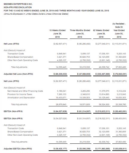 MedMen refers to certain non-IFRS financial measures such as Earnings Before Interest, Taxes, Depreciation and Amortization (EBITDA), adjusted EBITDA (defined as earnings before interest, taxes, depreciation, amortization, less certain non-cash equity compensation expense, including one-time transaction fees and all other non-cash items) and four-wall retail gross margins. These measures do not have any standardized meaning prescribed by IFRS and may not be comparable to similar measures presented by other issuers.