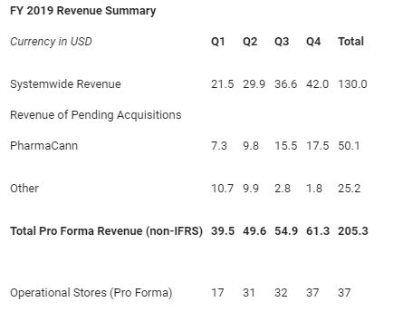 For the fiscal fourth quarter 2019, systemwide revenue across MedMen’s operations in California, Nevada, New York, Arizona and Illinois, excluding pending acquisitions, totaled US$42.0 million (CA$55.5 million), up 15% sequentially. This growth represents the Company’s third consecutive double-digit sequential revenue increase since going public in May 2018. For the fourth quarter, gross margins across retail operations were 50%, compared to 51% in the previous quarter. Pro forma systemwide revenue, which includes pending acquisitions that have not yet closed, totaled US$61.3 million (CA$81.0 million) for the quarter. This pro forma revenue figure is based on 37 retail stores that were operational at the end of the quarter and includes the recently announced pending acquisitions of operational retailers in Long Beach, California and Vallejo, California.