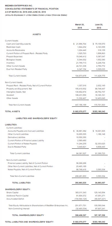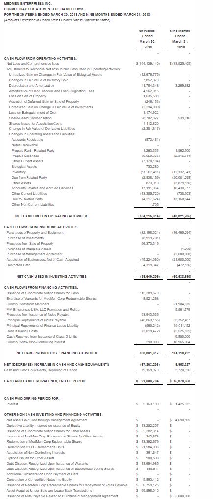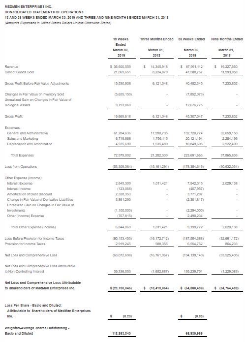 LOS ANGELES, May 29, 2019–(BUSINESS WIRE)–MedMen Enterprises Inc. (“MedMen” or the “Company”) (CSE: MMEN) (OTCQX: MMNFF) today released its consolidated financial results for the third quarter of fiscal 2019. All financial information for the 13 week period ended March 30, 2019 is reported in U.S. dollars, unless otherwise indicated.