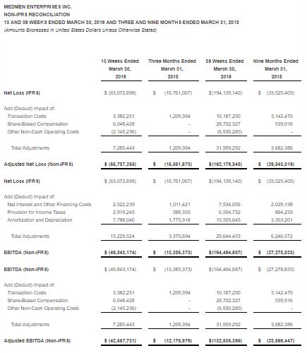 MedMen refers to certain non-IFRS financial measures such as Earnings Before Interest, Taxes, Depreciation and Amortization (EBITDA), adjusted EBITDA (defined as earnings before interest, taxes, depreciation, amortization, less certain non-cash equity compensation expense, including one-time transaction fees and all other non-cash items) and four wall retail gross margins. These measures do not have any standardized meaning prescribed by IFRS and may not be comparable to similar measures presented by other issuers.
