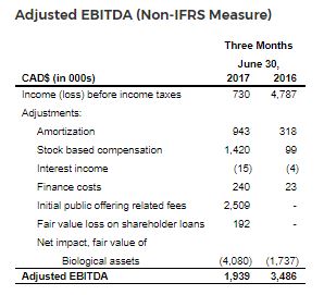 Adjusted EBITDA is used by management as a supplemental measure to review and assess operating performance and trends on a comparable basis. The Company defines Adjusted EBITDA as EBITDA adjusted for the impact of any unrealized expenses or gains, stock based compensation, fair value gains or costs arising from biological assets, expenses related to readying the Company for its initial public offering and other non-recurring costs the Company deems unrelated to current operations.