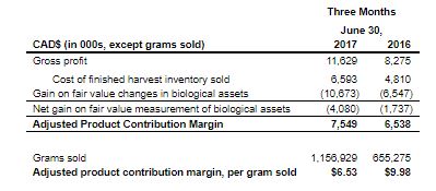 The following is the Company’s Adjusted Product Contribution Margin as compared to the reported gross profit, which includes the gain on changes in fair value of biological assets in accordance with IFRS, for the three months ended June 30, 2017 and 2016.