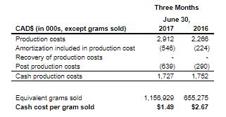 The following are the Company’s cash production costs, on a total and per gram sold basis, for the three and months ended June 30, 2017 and 2016, as compared to reported production costs (excluding costs resulting from the fair value of biological assets), which represents cost of sales, in accordance with IFRS:
