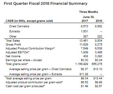 In the first quarter of fiscal 2018, MedReleaf successfully increased production and sales of cannabis-based extracts and matched an all-time low for the Company in cash cost per gram produced.