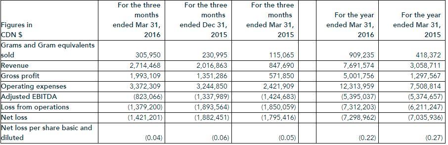 - Adjusted EBITDA loss amounted to a loss of $5,395,037 for the full year ended March 31, 2016 versus a loss of $5,374,657 in fiscal 2015.