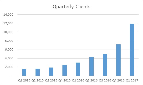 - Registered clients increased by 44% to 7,200 (as at June 29, 2016 – 12,000, a 67% increase since March 31, 2016)