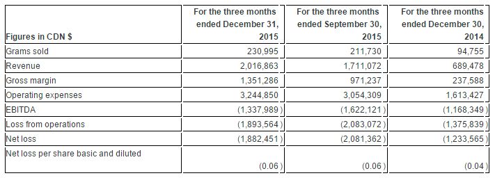 For the third quarter ended December 31, 2015, Mettrum revenues increased 18 percent to $2,016,683 versus $1,711,072 during the previous quarter. Average selling price per gram increased to $7.90 from $7.74 in the prior quarter. Gross margin increased by 39% to $1,351,287 or 67%, from $971,237 or 57% during the previous quarter. Mettrum reduced growing costs by 20% to $2.55 per gram for the quarter ended December 31, 2015 from $3.17 for the quarter ended September 30, 2015. EBITDA improved by 18% to a loss of $1,337,989 for the quarter ended December 31, 2015 versus a loss of $1,622,121 for the quarter ended September 30, 2015.