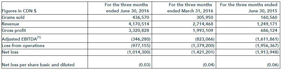 - Cash growing costs were reduced to $2.00 per gram for the quarter ended June 30, 2016 from $2.49 for the fourth quarter ended March 31, 2016.