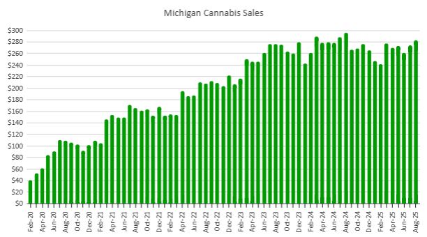 Michigan cannabis sales for August fell from a year ago as they rose sequentially by 3.2%, which was the same on a per-day basis. At $283.3 million, sales were down 4.1% from a year earlier: