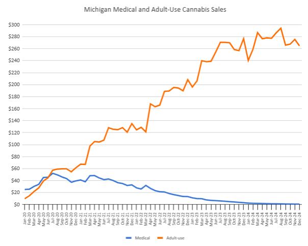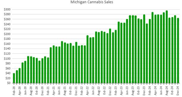 Michigan cannabis sales for December fell from a year ago and they fell sequentially 3.9% despite the extra day in the month. At $265.5 million, sales were down 5.2% from a year earlier: