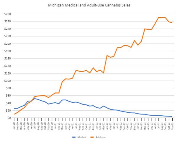 The Michigan Cannabis Regulatory Agency breaks out sales by medical and adult-use, with medical sales falling 72.0% from a year ago to $3.8 million, down 14.0% sequentially, and adult-use sales expanding 35.2% year-over-year to $256.7 million, down 0.7% sequentially: