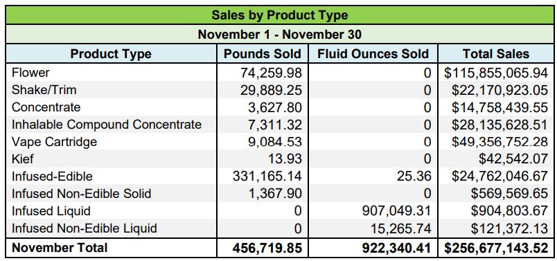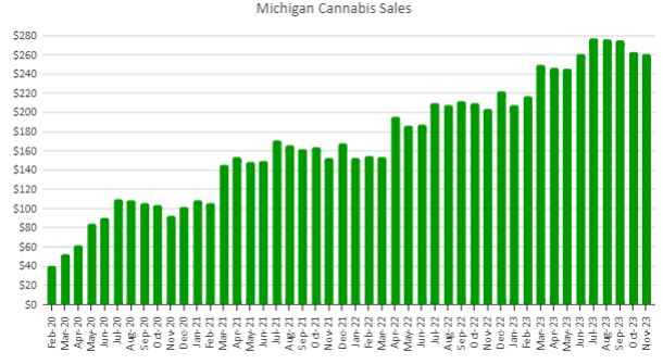 Michigan cannabis sales for November were down for the fourth consecutive month. At $260.5 million, sales fell 0.9% sequentially with the shorter month. They were up 28.1% from a year earlier: