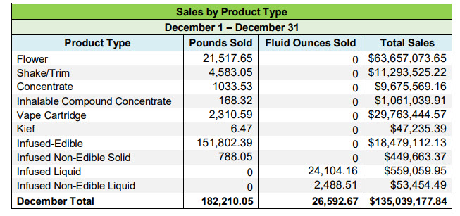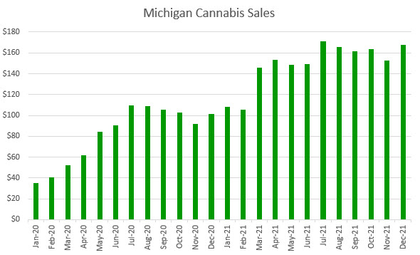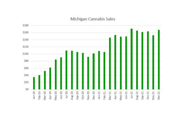 With one more day than in November, Michigan cannabis sales increased 10% to $168 million in December, up 66% from a year ago: