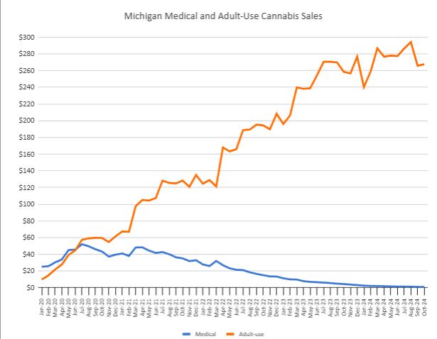The Michigan Cannabis Regulatory Agency breaks out sales by medical and adult-use, with medical sales falling 78.3% from a year ago to $1.0 million, down 5.9% sequentially, and adult-use sales rising 3.5% year-over-year to $267.6 million, up 0.7% sequentially: