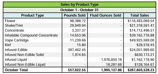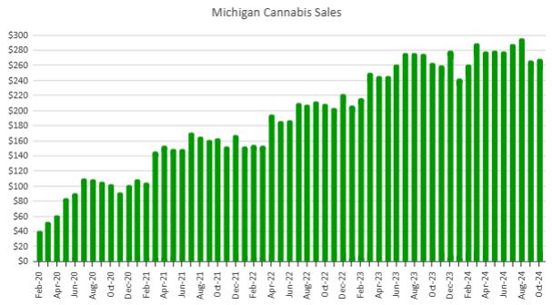 Michigan cannabis sales for October fell from a year ago in September and they rose sequentially 0.6% in October. At $268.6 million, sales were up 2.2% from a year earlier: