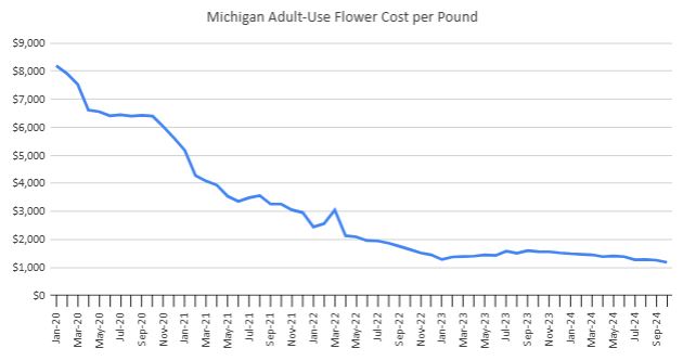 As supply continues to expand, flower pricing for adult-use has seen a dramatic decline. In October, the average price of $1184 per pound fell sequentially, dropping 6.0% and declining 24.2% from a year ago to a new low: