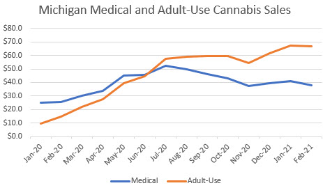 The Michigan Marijuana Regulatory Agency breaks out sales by medical and adult-use, with medical sales improving 48% from a year ago to $38.1 million and adult-use sales soaring 353% to $67.1 million: