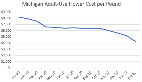 As supply continues to expand, flower pricing for adult-use has seen a dramatic decline. In February, the average price of $4275 per pound fell 18% from January and 46% from a year ago: