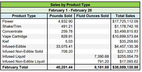 In the larger and more rapidly growing adult-use market, flower and trim sales represented 56% of the market, the same as January and up from 55% in December.