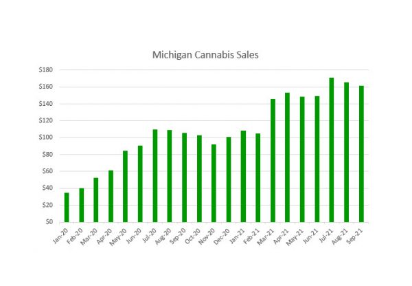 With one less day in September than August, Michigan cannabis sales slipped 2.5% to $161.4 million, up 52.5% from a year ago: