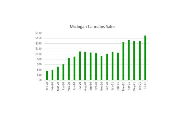 Stabilization in flower prices and strong adult-use demand boosted Michigan cannabis revenue to a record $171.1 million in July, up 15% from June and 56% from a year ago.