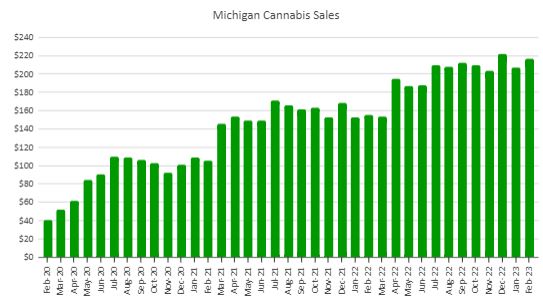 Michigan cannabis sales climbed 4.4% in February from January, reaching $216.4 million. On a per-day basis, sales increased 15.6%. The growth of 39.8% from a year ago was the highest over the past year: