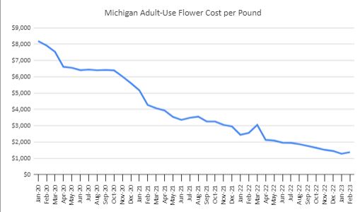As supply continues to expand, flower pricing for adult-use has seen a dramatic decline. In February, the average price of $376 per pound rose 7.3% sequentially and fell 46.3% from a year ago: