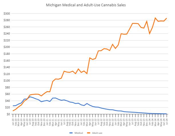 The Michigan Cannabis Regulatory Agency breaks out sales by medical and adult-use, with medical sales falling 77.9% from a year ago to $1.4 million, down 5.7% sequentially, and adult-use sales expanding 5.8% year-over-year to $286.4 million, up 3.2% sequentially: