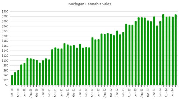 Michigan cannabis sales for July rose sequentially 3.2% from June with the increase in days. At $287.7 million, sales were up 4.0% from a year earlier, the slowest annual growth in over two years: