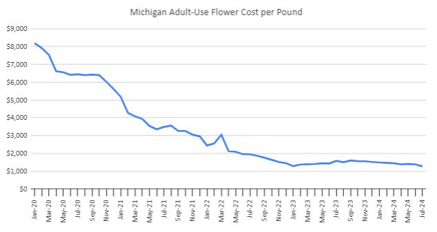 As supply continues to expand, flower pricing for adult-use has seen a dramatic decline. In July, the average price of $1275 per pound plunged sequentially, falling 7.9% and declining 19.2% from a year ago: