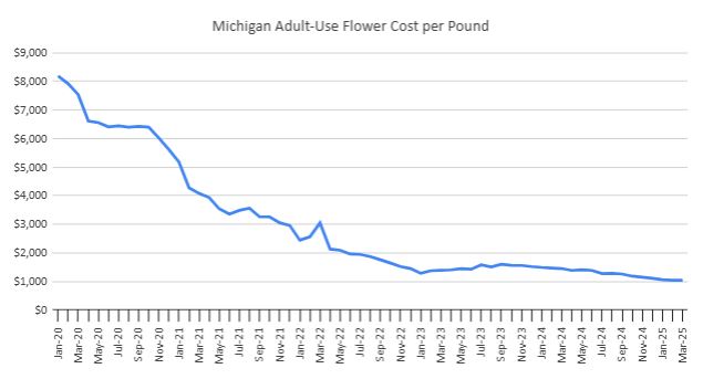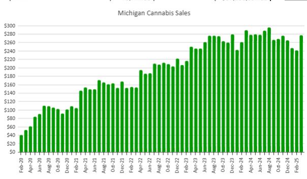 Michigan cannabis sales for March fell from a year ago as they rose sequentially by 14.5%, which was up on a per-day basis. At $277.0 million, sales were down 4.1% from a year earlier: