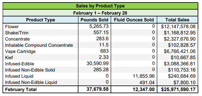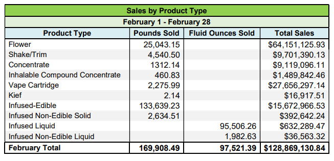 In the larger and more rapidly growing adult-use market, flower and trim sales represented 57% of the overall market, the same as in January, slightly higher than the 56% in Q4 and similar to the 57% in Q3.