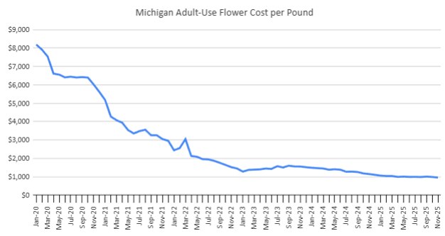 Michigan cannabis sales for November fell from a year ago as they fell sequentially by 3.0%, which was +0.2% on a per-day basis. At $259.7 million, sales were down 6.0% from a year earlier: