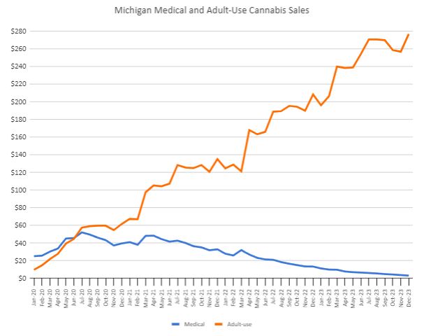 The Michigan Cannabis Regulatory Agency breaks out sales by medical and adult-use, with medical sales falling 76.2% from a year ago to $3.2 million, down 15.8% sequentially, and adult-use sales expanding 32.8% year-over-year to a record $276.7 million, up 7.8% sequentially: