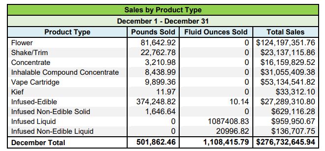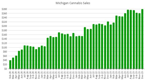Michigan cannabis sales for December were were up sequentially for the first time since July. At $279.9 million, sales rose 7.5% sequentially with the longer month perhaps helping explain part of the gain. They were up 26.2% from a year earlier: