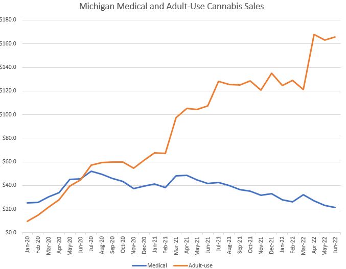 The Michigan Marijuana Regulatory Agency breaks out sales by medical and adult-use, with medical sales falling 48.4% from a year ago to $21.5 million, down 7.6% sequentially, and adult-use sales expanding 54.5% year-over-year to $165.9 million, up 1.7% sequentially: